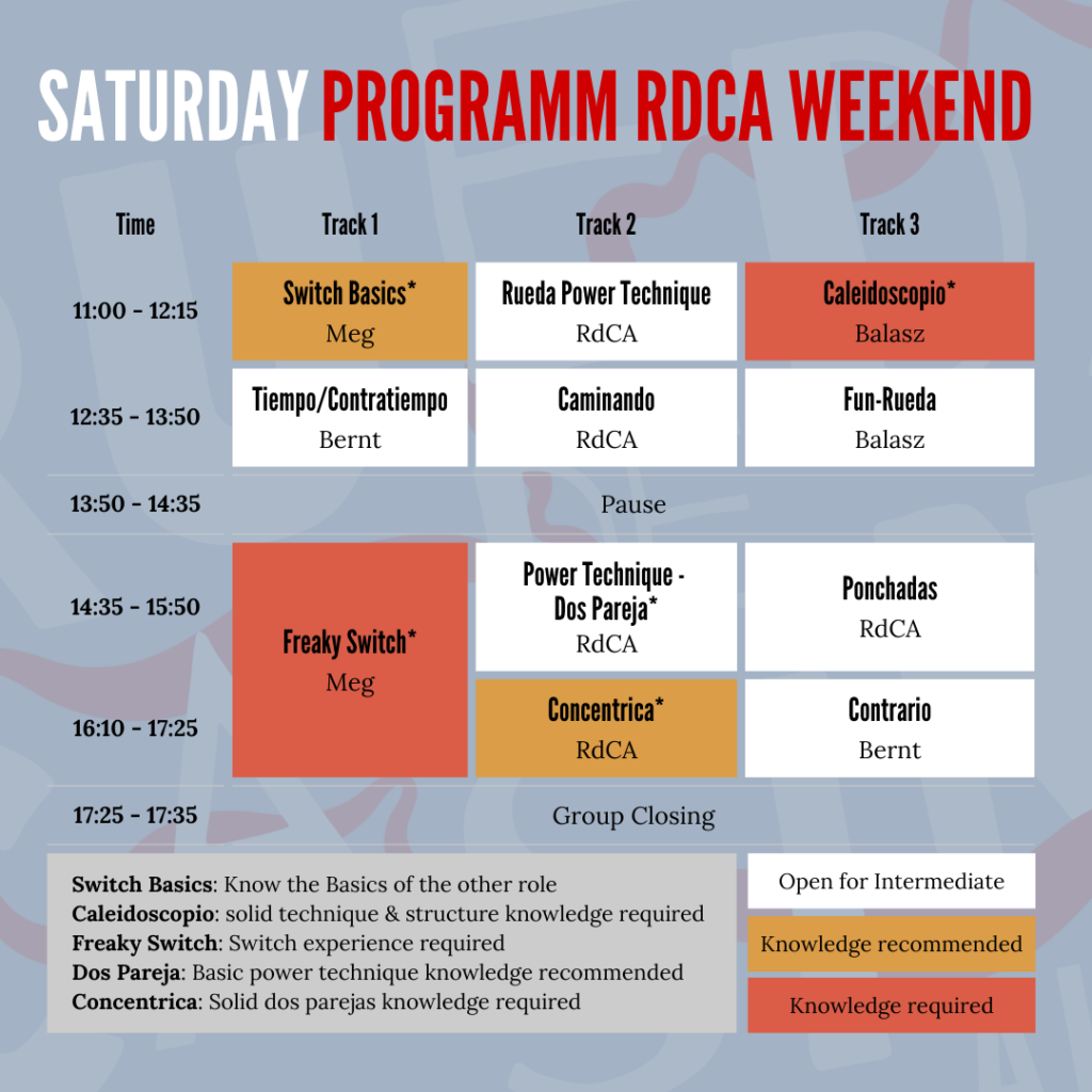 The RdCA Weekend 2026 is designed for Intermediate+ to Advanced Rueda dancers.