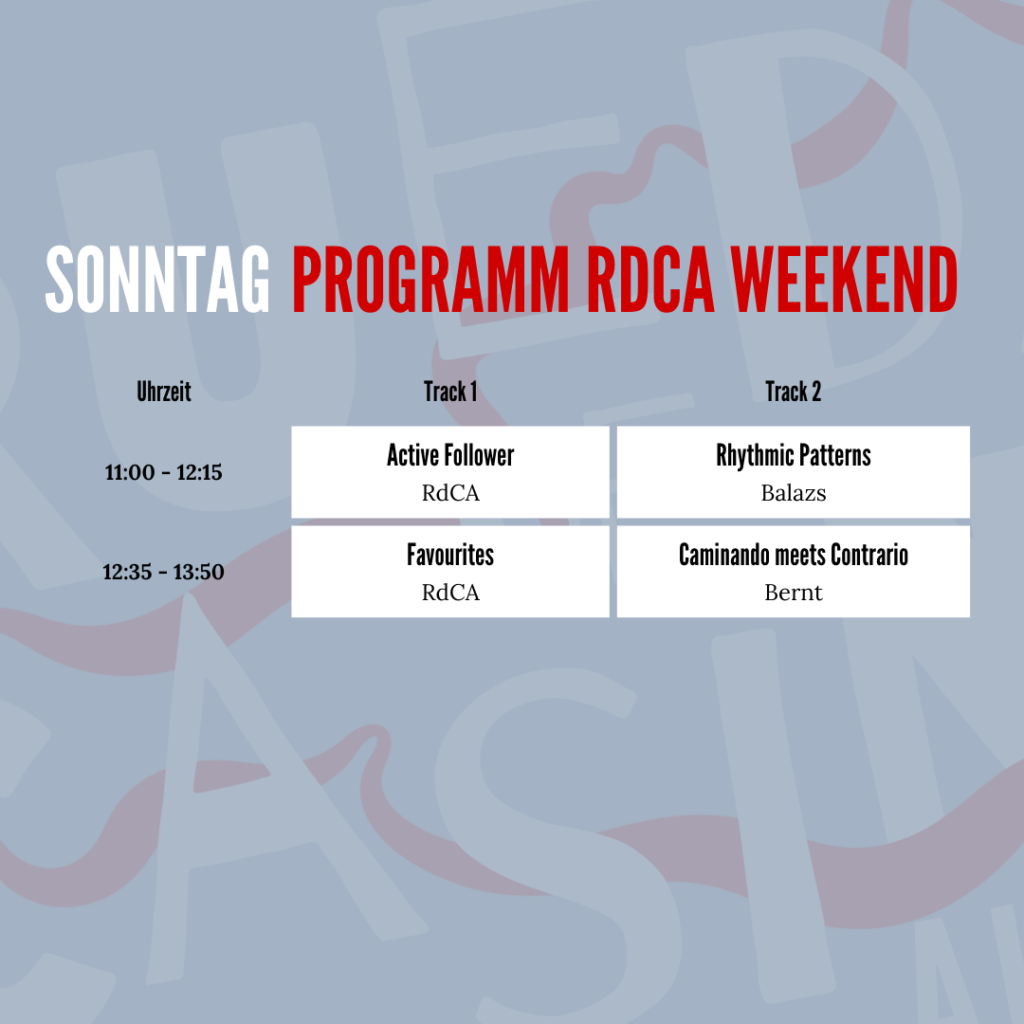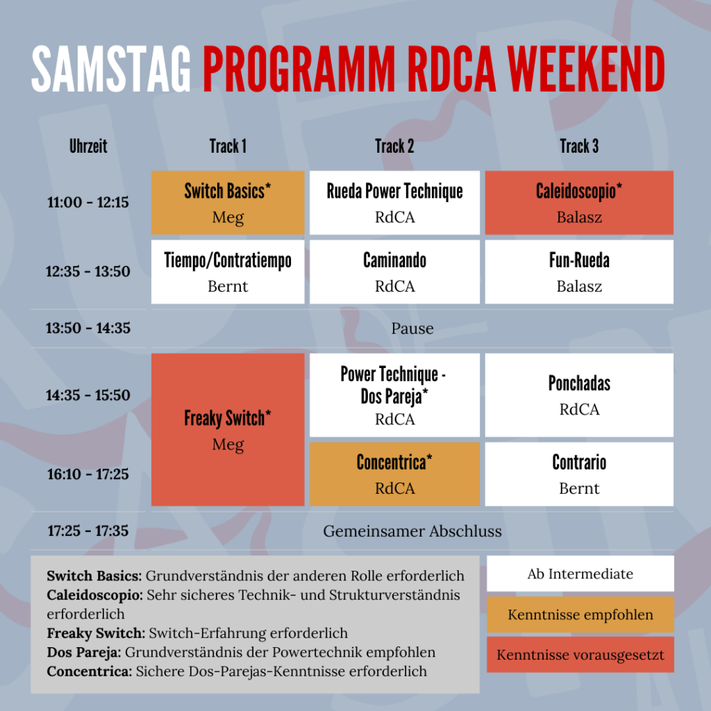 Viele Workshops sind für alle auf RdCA-Weekend-Level offen, einige Einheiten bauen jedoch bewusst auf bestimmter Vorerfahrung auf (z. B. Switch, Strukturen oder Dos Parejas).